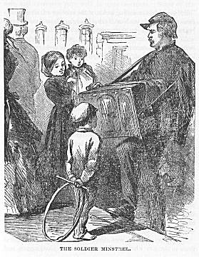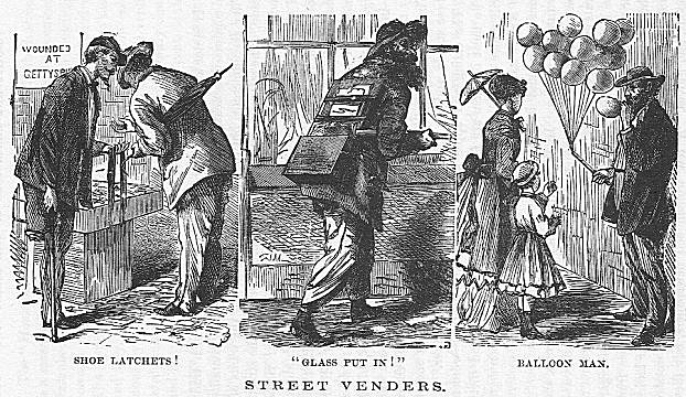 The balloon men, the penny whistle and pop gun dealers frequent the upper streets, where they are apt to be seen by children. The lame soldier sets up his stand anywhere, and deals principally in shoe strings, neckties, or in books and papers that no one ever reads. Towards Christmas large booths for the sale of toys are erected on some of the east and west side streets, at which a thriving business in toys and fire-works is carried on.