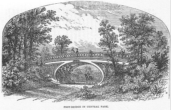 The southern portion is densely built up. Between the City Hall and Twenty-third street New York is more thickly populated than any city in America. It is in this section that the “tenement houses,” or buildings containing from five to twenty families, are to be found. The greatest mortality is in these over-crowded districts, which the severest police measures cannot keep clean and free from filth. The southern portion of the city is devoted almost exclusively to trade, comparatively few p. 51persons residing below the City Hall. Below Canal street the streets are narrow, crooked, and irregular. Above Houston street they are broad and straight, and are laid out at regular intervals. Above Houston street, the streets extending across the island are numbered. The avenues begin in the vicinity of Third street, and extend, or will extend to the northern limit of the island, running parallel with the Hudson River. There are twelve fine avenues at parallel distances apart of about 800 feet. Second and Eighth are the longest, and Fifth, Madison and Lexington the most fashionable. They commence with Avenue D, a short street, near the East River. West of this, and parallel with it, are three avenues somewhat longer, called Avenues C, B, and A, the last being the most westerly. Then begin the long avenues, which are numbered First, Second, and so on, as they increase to the westward. There are two other avenues shorter than those with numbers, viz: Lexington, lying between Third and Fourth, and extending from Fourteenth street on the south to Sixty-ninth street on the north; and Madison, between Fourth and Fifth, and extending from Twenty-third street at Madison Square to Eighty-sixth street. Madison and Lexington are each to be prolonged to the Harlem River. These avenues are all 100 feet wide, except Lexington and Madison, which are seventy-five feet wide, and Fourth avenue, above Thirty-fourth street, which is 140 feet wide. Third avenue is the main street on the east side above the Bowery, of which it is a continuation, and Eighth avenue is the principal highway on the west side. Fifth and Madison avenues are the most fashionable, and are magnificently built up with private residences below the Park. The cross streets connecting them are also handsomely built.