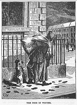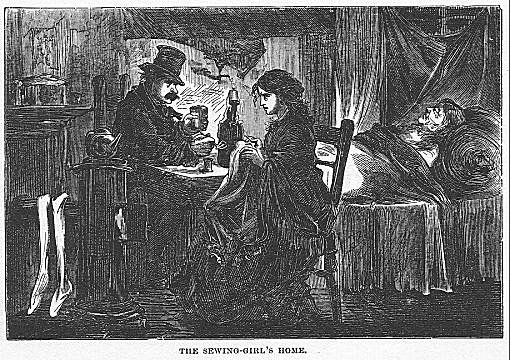Now, in order to pay the rent of her bare and cheerless room, the sewing woman must make two whole shirts a day. Then she must do work enough to provide for her other expenses. She has to buy fuel in the winter, and kindling wood costs her three cents a bundle and coal fifteen cents a pail. Perhaps she has children, or a sick and helpless, or, worse still, a drunken husband to provide for. All out of her beggarly wages. Her food consists almost entirely of bread and potatoes, and sometimes she treats herself to the luxury of a cup of tea without milk or sugar. If she owns a sewing machine, and very few do, she can earn more than one who sews by hand, but constant work at the machine means a speedy breaking down of her health and a lingering death, or a transfer to the charity hospital.