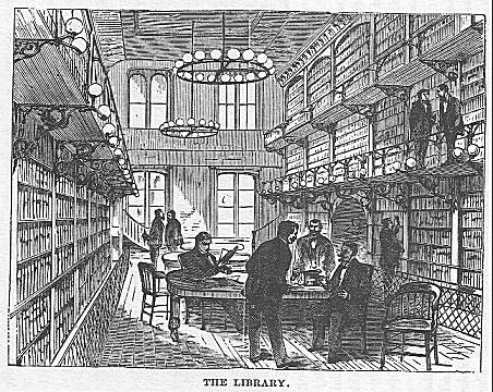 The second and third floors are used exclusively by the Association. At the head of the grand stairway which leads from the main entrance in Twenty-third street, is a large hall. On the left of this stairway is the main hall or lecture-room, one p. 813of the handsomest and most convenient public halls in the city. At the upper end is a fine platform with every convenience for lectures or concerts. The floor is provided with iron arm chairs, arranged after the manner of those in the parquet of Booth’s Theatre. A large gallery extends around three sides of the hall, and is similarly provided with seats. The hall is two stories in height, is beautifully decorated, and will seat with comfort fifteen hundred people. On one side of the platform is a retiring room, and on the other is a large and handsomely decorated organ. This is one of the finest instruments in the city, and is a novelty in some respects, being furnished with a drum, a triangle, and a pair of cymbals. Organ concerts, lectures, and concerts by celebrated performers are given weekly during the fall and winter. On Sunday, religious services are held in the hall, the pastors of the different city churches officiating at the invitation of a committee of the Association in charge of these services.