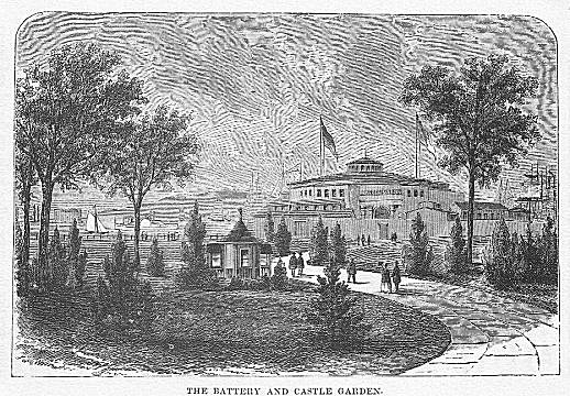 In the year 1807, work was begun on this building by order of the General Government, the site having been ceded by the city. It was intended to erect a strong fortification, to be called Castle Clinton, but, in 1820, it was discovered that the foundations were not strong enough to bear heavy ordnance, and Congress reconveyed the site to the city. The building was then completed as an opera house, and was used for several years for operatic and theatrical performances, concerts, and public receptions. It was the largest and most elegant hall in the country, and was the favorite resort of pleasure-seekers. Jenny Lind sang there, during her visit to the United States. It was used for public amusements until 1825, when, the wealth and fashion of the city having removed too high up town to make it profitable, it was leased to the Commissioners of Emigration as a landing-place for emigrants.