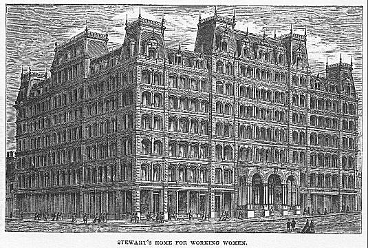 Mr. A. T. Stewart is now erecting, on Fourth avenue, a magnificent iron building, which is to be used as a “Home for Working Women.” The building extends along the avenue, from Thirty-second to Thirty-third street, a distance of 192 feet, and has a depth of 205 feet. Including the central Mansard roofs, the building is eight stories in height. It is one of the finest edifices in the city, and will be provided with every convenience for the work to which it is destined. It will be capable of accommodating fifteen hundred boarders, and will be conducted on a plan similar to that of the “Home for Working Women” in Elizabeth street. It is not to be conducted as a charity. Each occupant is to pay a fixed sum per week; and it is believed that here this sum will not exceed two dollars a week for board, lodging, and washing.