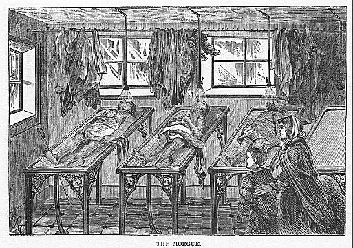 There stands on the shore of the East River, at the foot of Twenty-sixth street, a massive gray-stone building, known as Bellevue Hospital. Over the lowest door of the front, on the upper side of Twenty-sixth street, is a single word in gilt letters—MORGUE. This door marks the entrance to the Dead House of New York, one of the most repulsive, but most terribly fascinating places in the city. The place is named after the famous dead house of Paris, and the interior is arranged in exact imitation of it, except that it is smaller. It is a gloomy-looking place, this Morgue, and it is always crowded. Bodies found in the streets or in the harbor are brought here for identification. They are kept a certain length of time, usually from twenty-four to forty-eight hours, and if not claimed by relatives or friends, are buried at the expense of the city. Every article of clothing, every trinket, or other means of identification, found with a body, is carefully preserved, in the hope that it may lead to a discovery of the cause of the death.