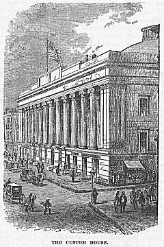 The Custom House is one of the most prominent and interesting places in New York. It is one of the largest in the country, and is provided with every facility for the prompt despatch of the vast business transacted in it. Five-sixths of all the duties on imports collected in the United States are received here.