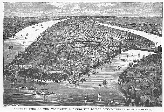 The city of New York, the largest and most important in the United States, is situated in New York County, on Manhattan Island, at the mouth of the Hudson River, eighteen miles from the Atlantic Ocean. The city limits comprise the entire county of New York, embracing Manhattan Island, Randall’s, Ward’s, and Blackwell’s Islands, in the East River, and Governor’s, Bedloe’s, and Ellis’ Islands, in the bay. The last three are occupied by the military posts of the United States Government. Manhattan Island is bounded on the north by Spuyten Duyvel Creek and the Harlem River—practically the same stream; on the east by the East River, on the west by the Hudson, and on the south by New York Bay. It is nine miles long on the east side, thirteen and a half miles long on the west side, and two and a half miles wide at its greatest breadth, the average breadth being a mile and a half. It is but a few feet in width at its southern extremity, but spreads out like a fan as it stretches away to the northward. The southern point is but a few inches above the level of the bay, but the island rises rapidly to the northward, its extreme northern portion being occupied by a series of bold, finely wooded heights, which p. 50terminate at the junction of the Hudson River and Spuyten Duyvel Creek, in a bold promontory, 130 feet high. These hills, known as Washington Heights, are two or three miles in length. The southern portion of the island is principally a sand-bed, but the remainder is very rocky. The island covers an area of twenty-two square miles, or 14,000 acres. It is built up compactly for about six miles, along the east side, and irregularly to Harlem, three miles farther. Along the west side it is built up compactly to the Central Park, Fifty-ninth street, and irregularly to Manhattanville, One hundred and twenty-fifth street, from which point to Spuyten Duyvel Creek it is covered with country seats, gardens, etc. Three wagon, and two railroad bridges over the Harlem River connect the island with the mainland, and numerous lines of ferries afford communication with Long and Staten Islands, and New Jersey. The island attains its greatest width at Fourteenth and Eighty-seventh streets.