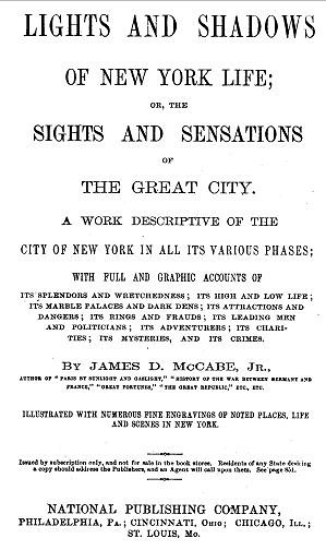 It is the desire of every American to see New York, the largest and most wonderful city in the Union. To very many the city and its attractions are familiar, and the number of these persons is increased by thousands of new comers every year. A still greater number, however, will know the Great City only by the stories that reach them through their friends and the newspapers. They may never gaze upon its beauties, never enjoy its attractions in person. For their benefit I have written these pages, and I have endeavored to present to them a faithful picture of the “Lights and Shadows” of the life of this City, and to describe its “Sights and Sensations” as they really exist.