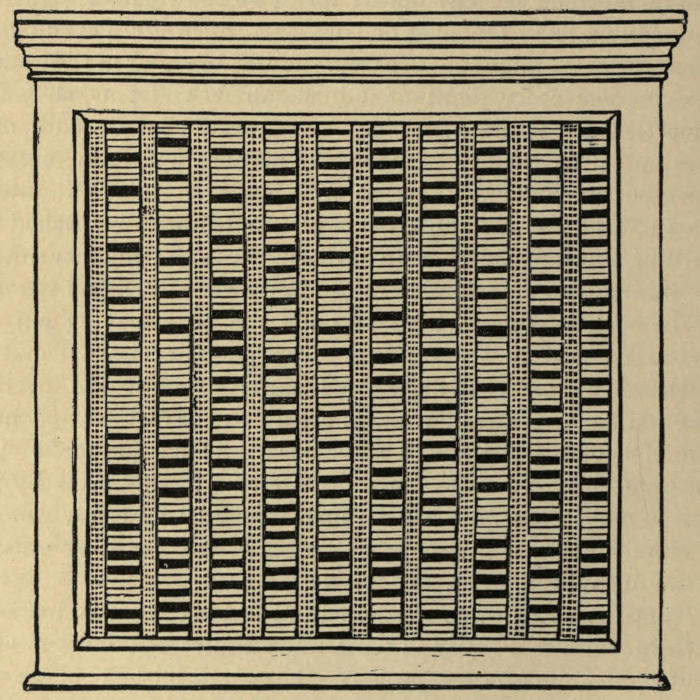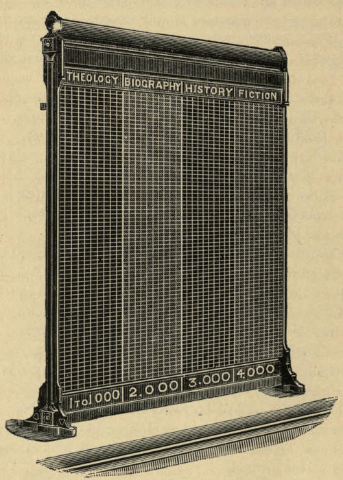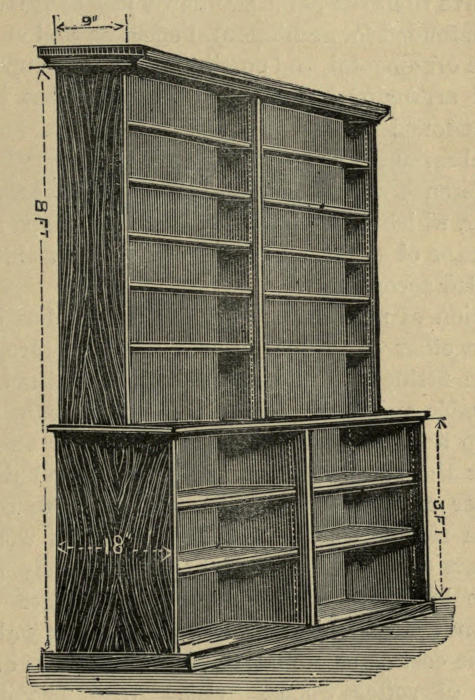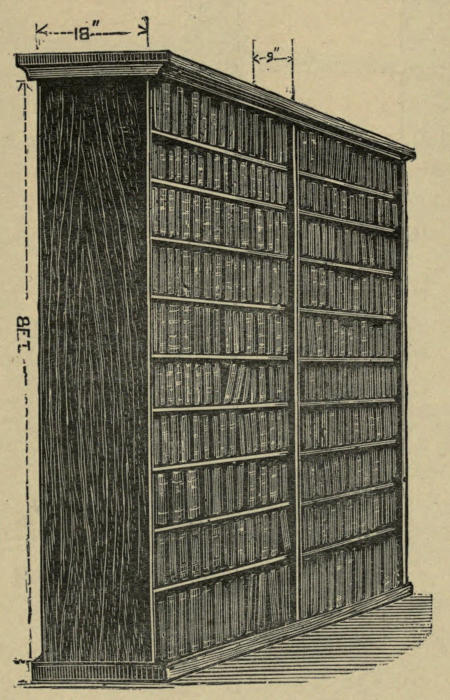 Standard cases or presses, designed for what is called the “stack” system of arrangement, are constructed with shelves on both sides, and are intended to stand by themselves on the floor. They are without doors or glass fronts, and their dimensions must be decided entirely by the requirements of each library and the class of books they are to contain. For ordinary lending libraries a very convenient double case with ten shelves of books to the tier can be made about 9 feet 6 inches wide × 8 feet 6 inches high, including cornice and plinth × 18 inches deep—the depth of the shelves being about 9 inches, their length 3 feet, and their thickness, as finished, not less than ¾″ nor more than 1 inch. Such a case will hold about 1800[3] volumes in 8vo and 12mo sizes, and the top shelf can be reached by a middle-sized person from a step or stool 12 inches high. Lower cases should be provided if rapidity of service is particularly required and there is plenty of floor space to carry the stock. The top shelf of a case 7 feet high, including cornice and plinth, can be reached from the floor by any one of ordinary height, small boys and girls of course excluded. These cases are made with middle partitions between the backs of the shelves, though some librarians prefer a simple framework of uprights, cornice, and plinth. For the sake of security and the necessary rigidity a central partition ought to be included, and if this is formed of thin ¼″ boarding, double and crossing diagonally, with a strong iron strap between screwed tight into the outer uprights, all tendency to bulging will be obviated, and the cases will be firm and workmanlike. The skeleton or framework cases have to be[4] stayed in all directions by iron rods and squares fixed in the floor, and, when empty, look very unsightly and rickety; besides, books get pushed or tumble over on to the adjoining shelf, and the plea of ventilation, which is practically the only recommendation for this plan of construction, loses much of its weight in a lending library where most of the books are in circulation.