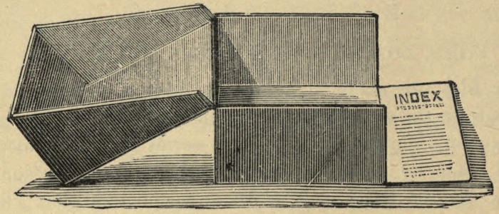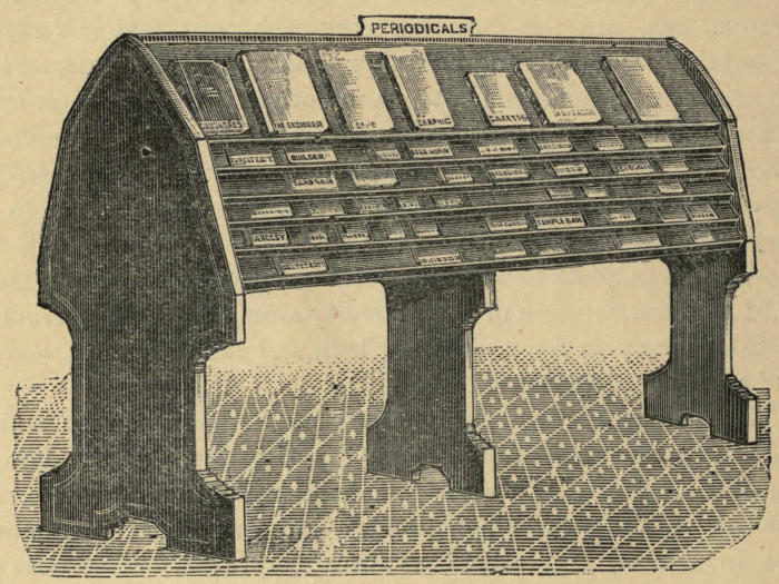 This design is now used in a large number of Libraries and Reading Rooms with great advantage. Periodicals of any size can be kept alphabetically arranged either in covers or without. There are no clips, springs, or other mechanical fittings, but everything is as simple as can be.