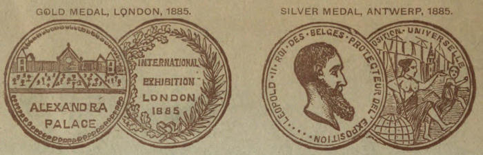 GOLD MEDAL, LONDON, 1885. SILVER MEDAL, ANTWERP, 1885.