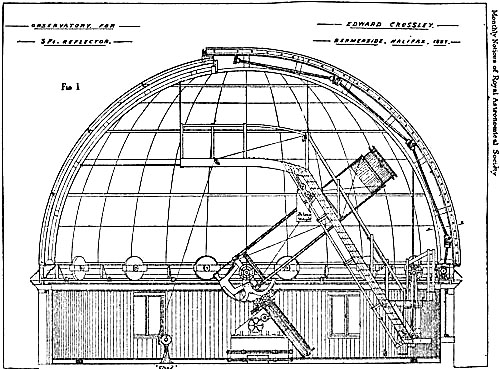 The Crossley reflector, at present the largest instrument of its class in America, was made in 1879 by Dr. A. A. Common, of London, in order to carry out, and test by practical observation, certain ideas of his respecting the design of large reflecting telescopes. For the construction of the instrument embodying these ideas, and for some fine astronomical photographs obtained with it, Dr. Common was awarded the gold medal of the Royal Astronomical Society in 1884.