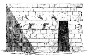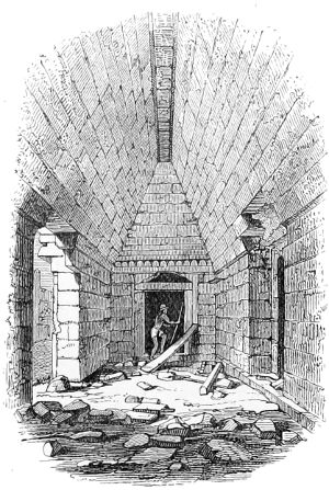 124. The Rev. Professor Stokes, in a paper communicated to the Royal Society of Antiquaries in Ireland, and published in their Journal, 1891, states: “The connexion with Egypt of the Celtic Church of these Western Islands of Britain, as well as of Ireland, cannot now be controverted.” He points out that the object of the ancient monks of the 5th and 6th centuries was “not to draw large assemblies, but to get as far away from them as possible; and assuredly they selected a lonely if not a weird spot when they selected the Skelligs.” The Professor gives a long list of places where specimens of these island monasteries can be found; the best example still existing being that of Incheleraun in Lough Ree, and commonly called Quaker Island, some ten miles above Athlone, where six or seven tiny churches just like those of Clonmacnoise (Woodcut No. 904) or Glendalough (Woodcut No. 902) still perpetuate the name of St. Dermot or St. Diarmaid, the teacher of St. Kieran, and a Celtic saint and doctor who lived just after the days of St. Patrick and St. Bridget. The monastic cells at the Skelligs, which are known as beehive huts, are sometimes square and sometimes circular in plan, in both cases covered with domical roofs of stone laid in horizontal courses similar to the Treasury of Atreus (Woodcut No. 124). In some cases those chambers are so limited in height and width that it is possible neither to stand upright nor lie down in them with ease. These beehive huts are apparently the prototypes of the oratories which, though rectangular in plan, are, like the Oratory of Gallerus (Woodcut No. 917) and St. Kevin’s Kitchen, Glendalough (Woodcut No. 902), covered with roofs of stone all laid in horizontal courses.—Ed.