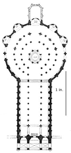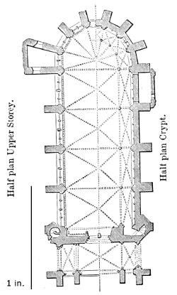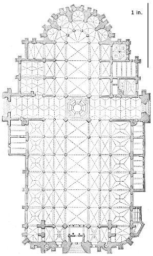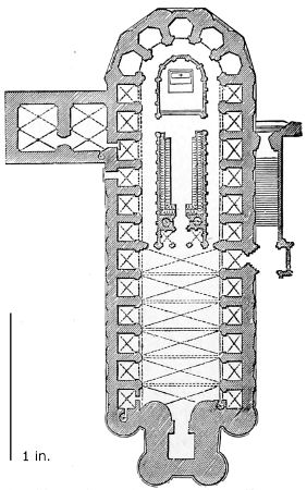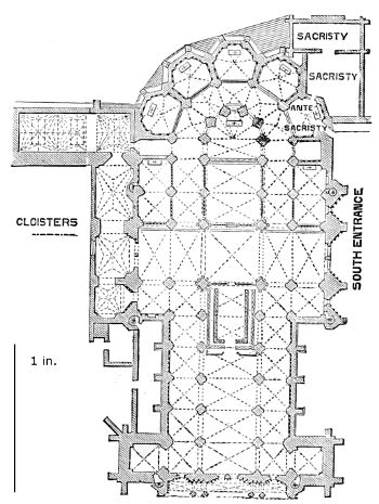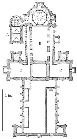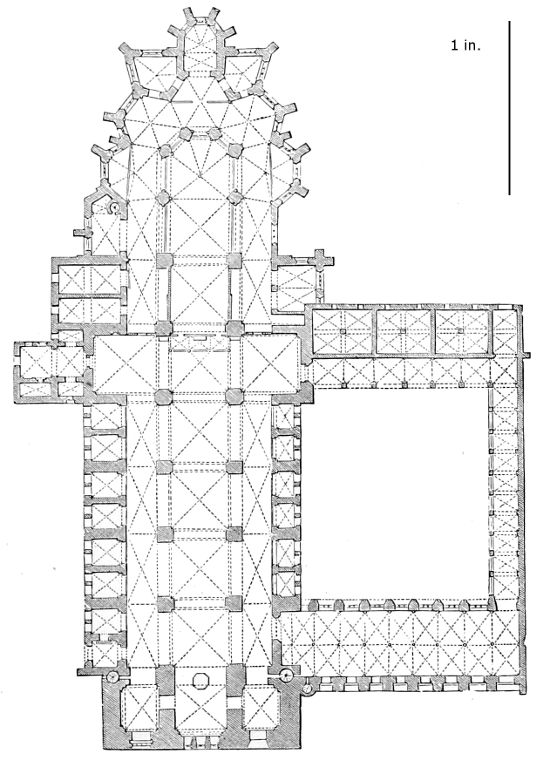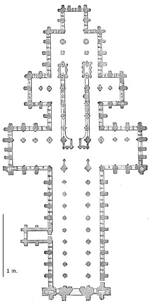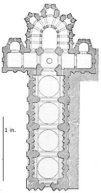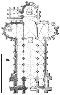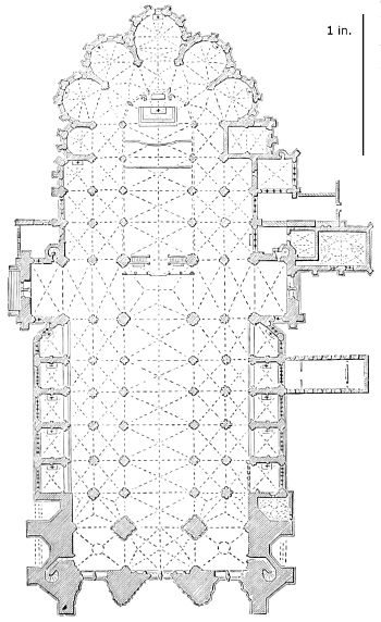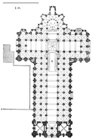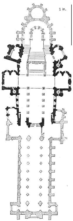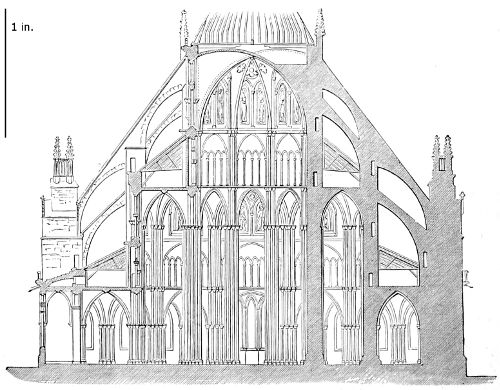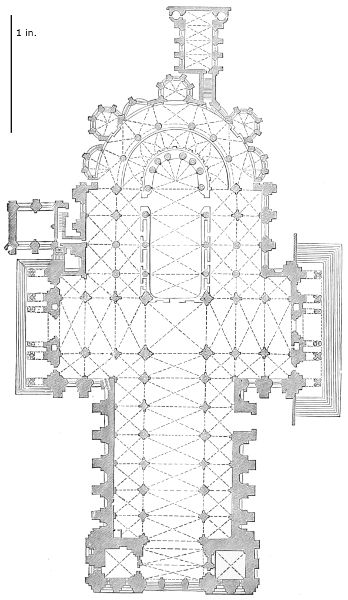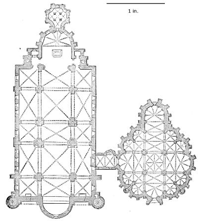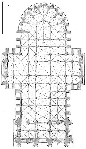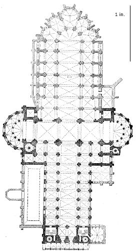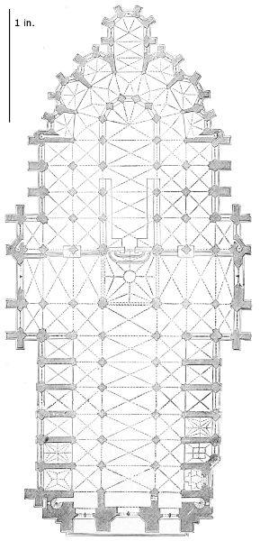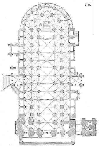 101. It should be remembered, however, that the first addition, made in 1220, was the original Lady Chapel; when Henry III. determined to rebuild the church and to adopt the plan of the French chevet, the width of the other chapels would seem to have been governed by that of the Lady Chapel. This, however, was 30 ft. wide—much greater than any French chapel. To complete the ring, therefore, he was obliged to carry them further west, so that the five chapels occupy a space equal in comparison to the seven chapels of Amiens, where the width of each is only 25 ft. A comparison of the two chevets will show how ingenious was the English arrangement; and as the vaulting is essentially English in its setting out and in its design, it is only the idea of the plan which was borrowed. On this subject Mr. Street remarks, p. 426 (‘Lectures on English Architecture,’ Memoir of G. E. Street, R.A., by A. E. Street, M.A. 1883), “Here the evidence of the building itself seems to be conclusive that the king had resolved to build a church after the model of the great French churches, but employed an English architect to design it, and he made his plan on lines which are distinct and different from those of any French church.”