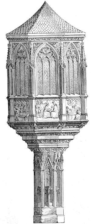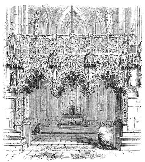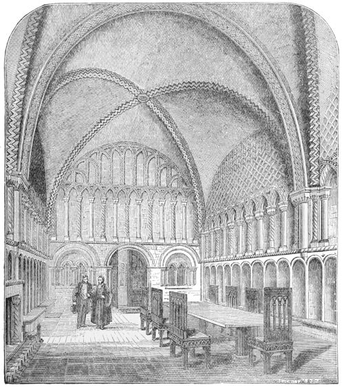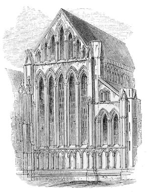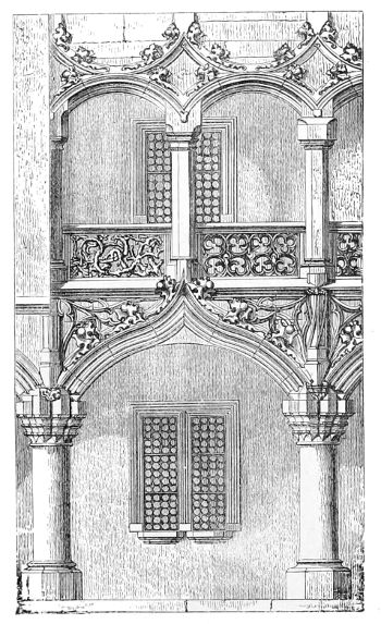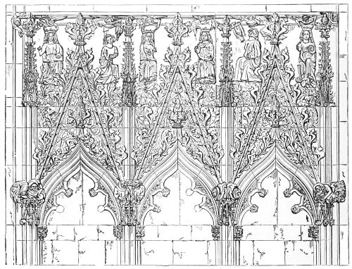 112. Few things of its class are more to be regretted than the destruction of this beautiful relic in rebuilding the Parliament Houses. It would have been cheaper to restore it, and infinitely more beautiful when restored than the present gallery which takes its place. It is sad, too, to think that nothing has been done to reproduce its beauties. When the colleges of Exeter at Oxford, or St. John’s, Cambridge, were rebuilding their chapels, it would have been infinitely better to reproduce this exquisite specimen of English art than the models of French chapels which have been adopted.