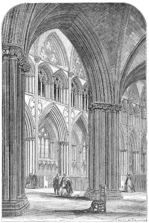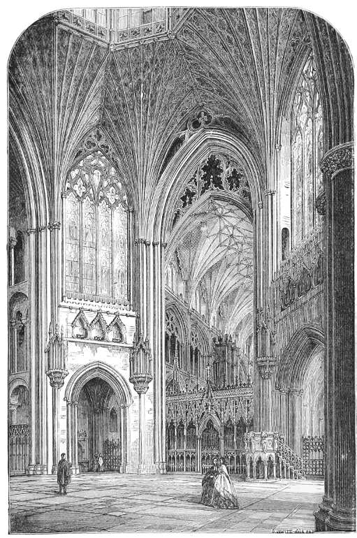 108. A splendid chance of trying the effect of this occurred a few years ago, when it was determined to restore the lantern, as a memorial to Dr. Peacock. In a fit of purism, only the ugly temporary arrangement was made new. It looked venerable before the recent repairs; now that it is quite new again, it is most unpleasing.