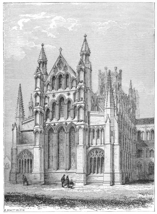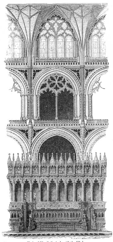 99. The proper effect of this part of Ely Cathedral has been seriously marred by the erection of the new reredos. In itself a fair specimen of modern Gothic, it is placed so far from the choir as to lose its proper effect. It is painfully dwarfed by the large plain area in front of it. But worse than this, it cuts up and destroys the most beautiful presbytery in England after the Angel Choir at Lincoln. The architects of Walsingham’s time glazed two compartments of the triforium to throw light upon the principal object in the choir, which was intended to stand two bays farther forward. It would have been well if the 19th-century restorers had taken the hint.