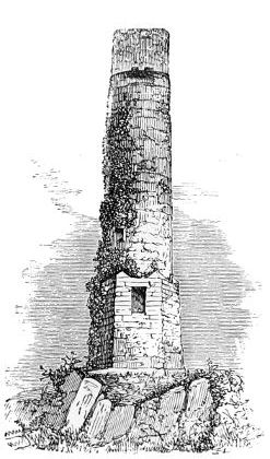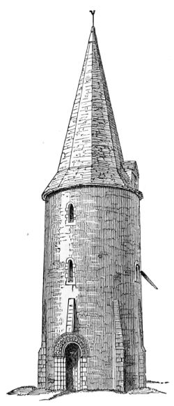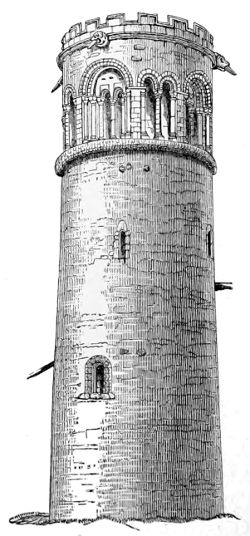 127. One of the towers in the East that bears most directly on the history of these Irish towers is that discovered by Dr. Tristram near Um Rasas. It is described and figured at page 145 in his work on the ‘Land of Moab;’ but unfortunately the woodcut is taken from the side that does not represent the doorway with the cross over it so like that at Antrim (Woodcut No. 907), and elsewhere. Like most of the Irish examples, it is situated at about 10 ft. from the ground. There is no other opening to the tower, except one on each face at the top. It has also the peculiarity that it stands free but close to a small cell or chapel, as is the case with almost all the Irish towers. The one point in which it differs from the Irish examples is that its plan is square instead of being circular. This does not seem so important as it at first sight may appear, seeing how many circular minarets were afterwards erected in the East, which must have had a model somewhere. Practically, therefore, this Moabite tower may be described, Hibernicè, as a square Irish round tower.
