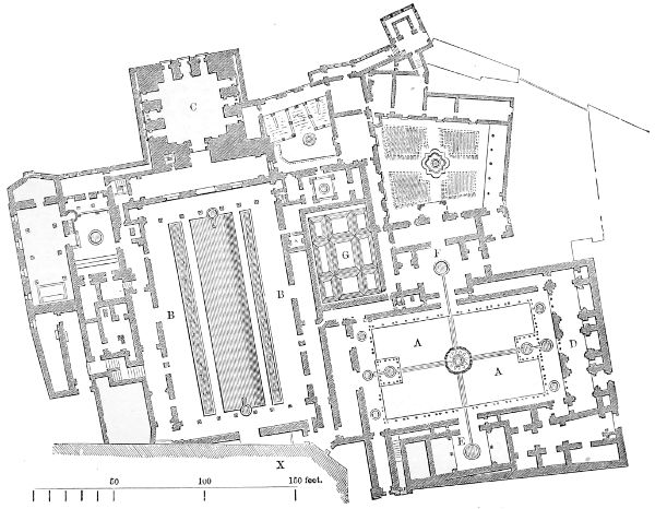 163. A perfect copy of this court was reproduced by Mr. Owen Jones at the Crystal Palace in 1854. Except being slightly curtailed in plan, every detail and every dimension is identical with the original.