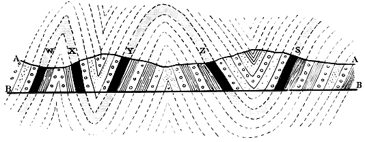 Though it is true that the slopes of this great mountain-chain not infrequently correspond more or less closely to the slope or inclination of the underlying rocks, it must not be supposed that this correspondence is often complete. Sometimes, indeed, we find that the mountains, so far from — 48 — coinciding with anticlines, are in reality built up of synclinal or basin-shaped strata; while in other cases deep and broad valleys run along the lines of anticlinal axes (Fig. 6). All this speaks to enormous erosion. A study of the geological structure of the Alps demonstrates that thousands of feet of rock have been removed from those mountains since the time of their elevation. A section drawn across any part of the chain would show that the strata have been eroded to such an extent, and the whole configuration so profoundly modified, that it is often difficult, or even impossible, to tell what may have been the original form of the surface when the chain was upheaved. And yet the Alps, it must be remembered, are of comparatively recent age, some of their highly-confused and contorted rocks consisting of marine strata which are of no greater antiquity than the incoherent clays and sands of the London Tertiary basin. Now, when we reflect upon the fact that, in the case of so young a mountain-chain, the configuration due to undulations of the strata has been so greatly modified, and even in many places obliterated, it is not hard to believe that after sufficient time has elapsed—after the Alps have existed for as long a period, say, as the mountains of middle Germany—every mountain formed of anticlinal strata shall have disappeared, and those synclines which now coincide with valleys shall have developed into hills. The reader who may have paid little or no attention to geological structure and its influence upon the form of the ground, will probably think this a strange and extravagant statement; yet I hope to show presently that it is supported by all that we know of regions of folded strata which have been for long periods of time subjected to denudation.