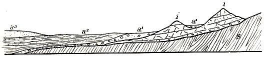 Again, let us draw a section across strata which have been fractured and dislocated, and we shall see how such fractures likewise enable us to estimate the minimum amount of erosion which certain regions have experienced. In Fig. 3 we have a series of strata containing a bed of limestone L, and a coal-seam a. The present surface of the ground is represented by the line A B. At F the strata are traversed by a fault or dislocation—the beds being thrown down for say 500 feet on the low side of the fault—so that the coal at a2 occurs now at a depth of 500 feet below its continuation at a1. At the surface of the ground there is no inequality of level—the beds overlying the coal (a2) having been removed by denudation. Were the missing rocks to be replaced, they would occupy the space contained within the dotted lines above the present surface A B. Such dislocations are of common occurrence in our coal-fields, and it is not often that they give rise to any features at the surface. We may thus traverse many level or gently-undulating tracts, and be quite unconscious of the fact that geologically we have frequently leaped up or dropped down for hundreds of feet in a single step. Nay, some Scottish streams and rivers flow across dislocations by which the strata have been shifted up or down for thousands of feet, and in some places one can have the satisfaction of sitting upon rocks which are geologically 3000 yards below or above those on which he rests his feet. In other words, thousands of feet of strata have been removed by denudation from the high sides of faults. These, as I have said, often give rise to no feature at the surface; but, occasionally, when “soft” rocks have been shifted by dislocations, and brought against “hard” rocks, the latter, by better resisting denudation than the former, cause a more or less well-marked feature at the surface, and thus betray the presence of a fault to the geologist. The phenomena presented by faults, therefore, are just as eloquent of denudation as is the truncated appearance — 43 — of our strata; and only after we have carefully examined the present extension and mutual relations of our rock-masses, their varied inclination, and the size of the dislocations by which they are traversed, can we properly appreciate the degree of erosion which they have sustained. Before we are entitled to express any opinion as to the origin of the surface-features of a country, we must first know its geological structure. Until we have attained such knowledge, all our views as to the origin of mountains are of less value than the paper they are written upon.