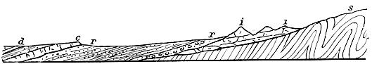 Thus in the geographical development of the Atlantic coast-lines we may note the following stages:—First, in Palæozoic times the formation of great mountain-uplifts, frequently accompanied by volcanic action. Second, a prolonged stage of comparative coastal tranquillity, during which the maritime ranges referred to were subject to such excessive erosion that they were planed down to low levels, and in certain areas even submerged. Third, renewed elevation (negative or positive) whereby considerable portions of the much-denuded Archæan and Palæozoic rocks, now largely covered by younger deposits, were converted into high-lands. During this stage not much rock-folding — 420 — took place, nor were any true mountains of elevation formed parallel to the Atlantic margins. It was otherwise, however, in the Mediterranean and Caribbean depressions, where coastal movements resulted in the formation of enormous linear uplifts. Moreover, volcanic action is now and has for a long time been more characteristic of these depressions than of the Atlantic coast-lands.