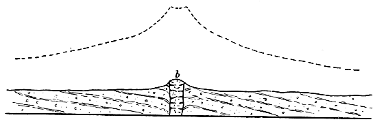 I have spoken of the evidence of denudation which we find in our truncated and dislocated rock-masses; there is yet another line of evidence which I may very shortly point out. As every one knows, there exist in this and many other countries enormous masses of igneous rocks, which have certainly been extruded from below. Now, some of these rocks, such as granite, belong to what is called the plutonic class of rocks; they are of deep-seated origin—that is to say, they never were erupted at the surface, but cooled and consolidated at great depths in the earth’s crust. I need not go into any detail to show that this is the case—it is a conclusion based upon incontrovertible facts, and accepted by every practical geologist. When, therefore, we encounter at the actual surface of the earth great mountain-masses of granite, we know that in such regions enormous denudation has taken place. The granite appears at the surface simply because the thick rock-masses under which it solidified have been gradually removed by erosion.