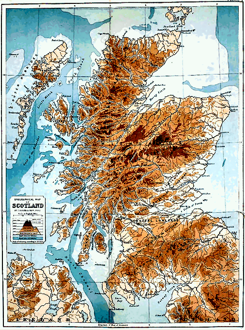 The physical features more particularly referred to in this paper are of course only the bolder and more prominent contours—those namely which can be expressed with sufficient accuracy upon sheets of such a size as the accompanying orographical map of Scotland (Plate I.). With larger maps considerably more detail can be added, and many characteristic and distinguishing features will appear according to the care with which such maps are drawn. In the case of the Ordnance Survey map, on the scale of 1 inch to a mile, the varying forms of the surface are so faithfully delineated as frequently to indicate to a trained observer the nature of the rocks and the geological structure of the ground. The artists who sketched the hills must indeed have had good eyes for form. So carefully has their work been done, that it is often not difficult to distinguish upon their maps hills formed of such rocks as sandstone from those that are composed of more durable kinds. The individual characteristics of mountains of schist, of granite, of quartz-rock, of slate, are often well depicted: nay, even the varieties of igneous rock which enter into the formation of the numerous hills and knolls of the Lowlands can frequently be detected by the features which the artists have so intelligently caught. Another set of features which their maps display are those due to glaciation. These are admirably brought out, even down to the — 35 — smallest details. A glance at such maps as those of Teviotdale and the Merse, for example, shows at once the direction taken by the old mer de glace. The long parallel flutings of the hill-slopes, roches moutonnées, projecting knolls and hills with their “tails,” the great series of banks and ridges of stony clay which trend down the valley of the Tweed—these, and many more details of interest to specialists, are shown upon the maps. All over Scotland similar phenomena are common, and have been reproduced with marvellous skill on the shaded sheets issued by the Ordnance Survey. And yet the artists were not geologists. The present writer is glad of this opportunity of recording his obligations to those gentlemen. Their faithful delineations of physical features have given him many valuable suggestions, and have led up to certain observations which might otherwise not have been made.