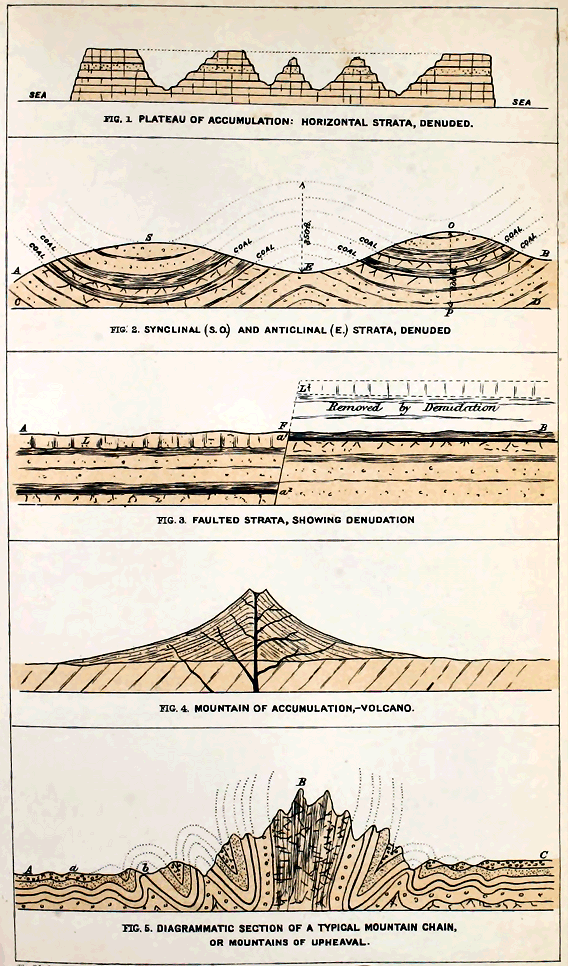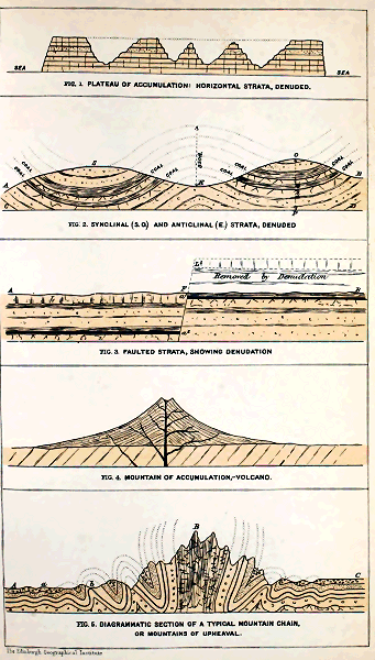 The study of geological structure, or the architecture of the earth’s crust, has enabled us to group all mountains under these three principal heads:—