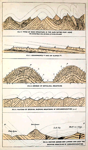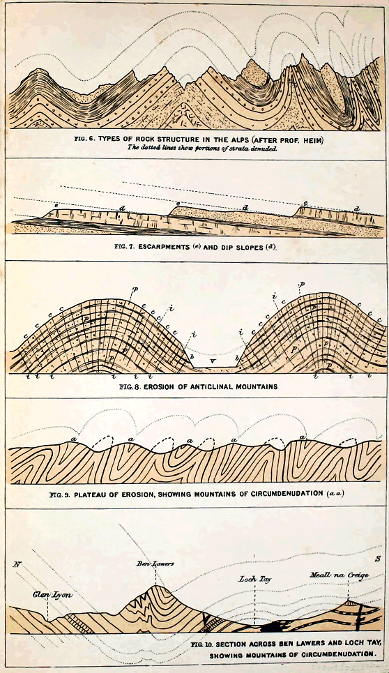 2. Mountains of Elevation.—We have seen that the strata which enter most largely into the composition of the earth’s crust, so far as that is open to observation, consist of rocks which must originally have been disposed in horizontal or approximately horizontal layers. But, as every one knows, the stratified rocks are not always horizontally arranged. In Scotland they rarely are so. On the contrary, they are inclined at all angles from the horizon, and not infrequently they even stand on end. Moreover, they are often traversed by dislocations, large and small. No one doubts that these tilted and disturbed rocks are evidence of wide-spread earth-movements. And it has been long known to geologists that such movements have happened again and again in this and many other countries where similar disturbed strata occur. Some of these movements, resulting in the upheaval of enormous mountain-masses, have taken place within comparatively recent geological times. Others again date back to periods inconceivably remote. The Pyrenees, the Alps, the Caucasus, the Himalaya, which form the back-bone of Eurasia, are among the youngest mountains of the globe. The Highlands of Scotland and Scandinavia are immeasurably more ancient; they are, in point of fact, the oldest high grounds in Europe, nor are there any mountain-masses elsewhere which can be shown to be older. But while the Alps and other recent mountains of elevation still retain much of their original configuration, not a vestige of the primeval configuration of our own Highlands has been preserved; their present surface-features have no direct connection with those which must have distinguished them in late Silurian times. Our existing mountains are not, like those of the Alps, mountains of elevation.
