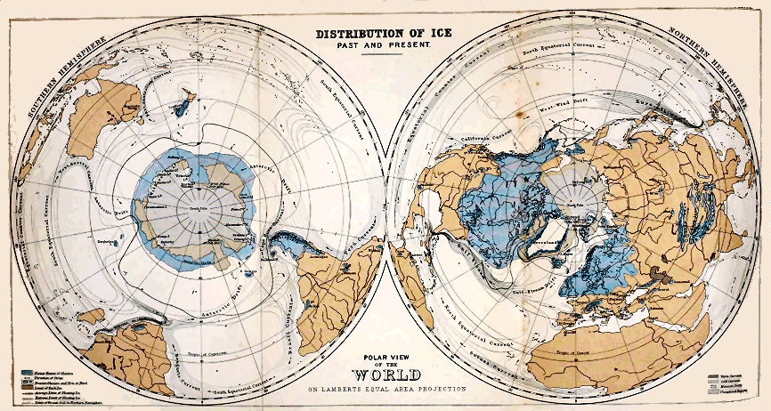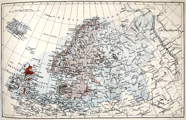 In order to appreciate the character of the climate which must have prevailed when the lands of the globe were much more interrupted and insular than at present, we have only to consider how greatly isothermal lines, even under existing continental conditions, are deflected by ocean-currents. In the North Atlantic, for example, the winter isotherm of 32° F. is deflected northward from the parallel of New York to that of Hammerfest—a displacement of at least 30° of latitude. The Arctic Sea now occupies a partially closed basin, into which only one considerable current enters from the south. But in earlier ages the case was otherwise, and there was often communication across what are now our continental areas. Instead of being girdled, as at present, by an almost continuous land-mass, the Arctic Sea seems to have formed with the circumjacent ocean one great archipelago. Thus freely open to the influx of southern currents, it is not difficult to believe that the seas of the far north might never be frozen, and that an “inland-ice” like that of Greenland would be impossible. The present cold summers of that country, as the late Dr. Croll has insisted, are due not so much to high latitude as to the presence of snow and ice. Could these be removed, the summers would be as warm at least as those of England. Now the occurrence in arctic regions of Palæozoic and Mesozoic marine faunas is strongly suggestive of the former presence there of genial waters having free communication with lower latitudes; and it is to the presence of these warm currents, flowing uninterruptedly through polar regions, that we would attribute the high winter temperature and uniform climate to which the fossil floras and faunas of Greenland bear testimony.