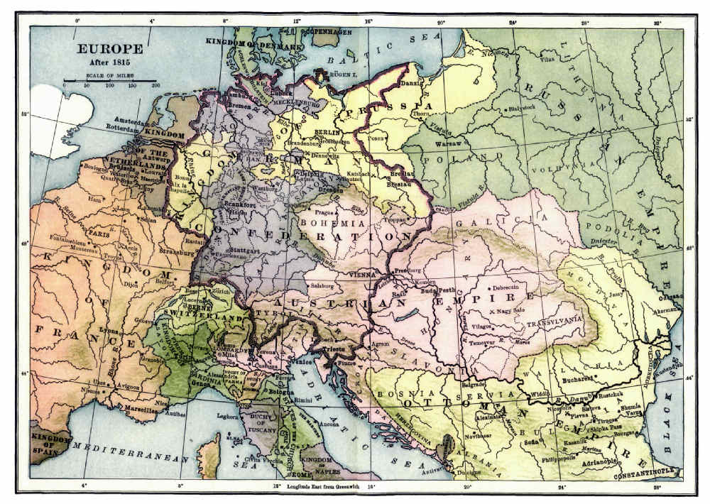 [440] Observe the boundary of the German Confederation as indicated on the map, pp. 626–627, above. Important portions of the German constitution of 1815 are given in Translations and Reprints, Vol. I, No. 3.