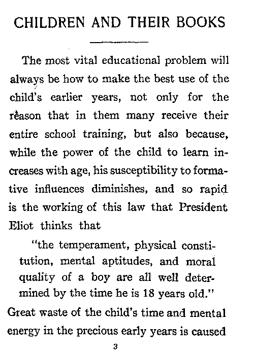 The most vital educational problem will always be how to make the best use of the child's earlier years, not only for the reason that in them many receive their entire school training, but also because, while the power of the child to learn increases with age, his susceptibility to formative influences diminishes, and so rapid is the working of this law that President Eliot thinks that