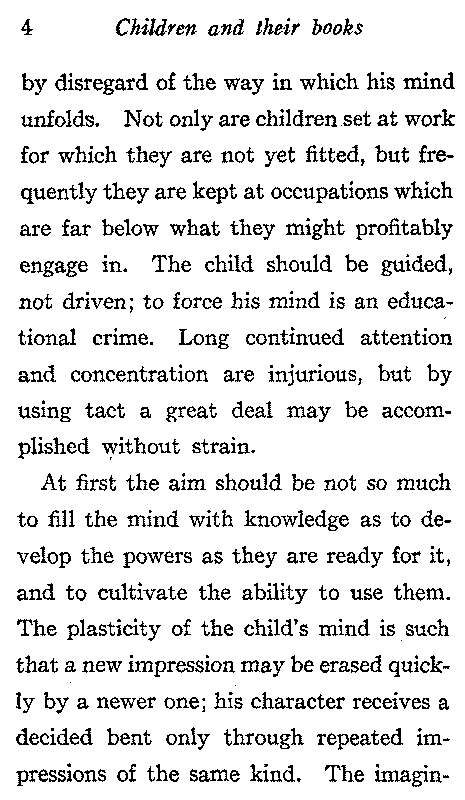 Great waste of the child's time and mental energy in the precious early years is caused[4] by disregard of the way in which his mind unfolds. Not only are children set at work for which they are not yet fitted, but frequently they are kept at occupations which are far below what they might profitably engage in. The child should be guided, not driven; to force his mind is an educational crime. Long continued attention and concentration are injurious, but by using tact a great deal may be accomplished without strain.