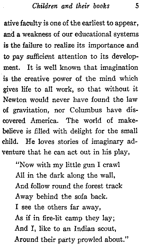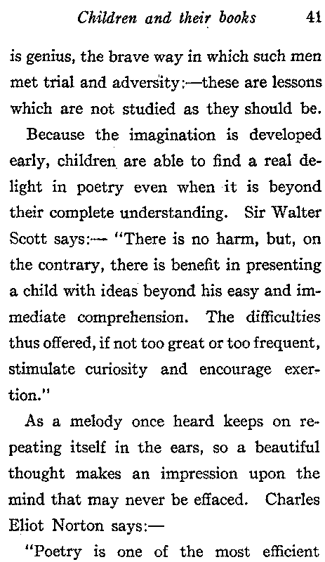 Because the imagination is developed early, children are able to find a real delight in poetry even when it is beyond their complete understanding. Sir Walter Scott says:—"There is no harm, but, on the contrary, there is benefit in presenting a child with ideas beyond his easy and immediate comprehension. The difficulties thus offered, if not too great or too frequent, stimulate curiosity and encourage exertion."