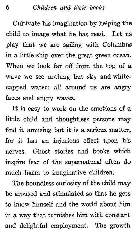 It is easy to work on the emotions of a little child and thoughtless persons may find it amusing but it is a serious matter, for it has an injurious effect upon his nerves. Ghost stories and books which inspire fear of the supernatural often do much harm to imaginative children.