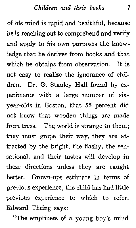 The boundless curiosity of the child may be aroused and stimulated so that he gets to know himself and the world about him in a way that furnishes him with constant and delightful employment. The growth[7] of his mind is rapid and healthful, because he is reaching out to comprehend and verify and apply to his own purposes the knowledge that he derives from books and that which he obtains from observation. It is not easy to realize the ignorance of children. Dr. G. Stanley Hall found by experiments with a large number of six-year-olds in Boston, that 55 percent did not know that wooden things are made from trees. The world is strange to them; they must grope their way, they are attracted by the bright, the flashy, the sensational, and their tastes will develop in these directions unless they are taught better. Grown-ups estimate in terms of previous experience; the child has had little previous experience to which to refer. Edward Thring says: