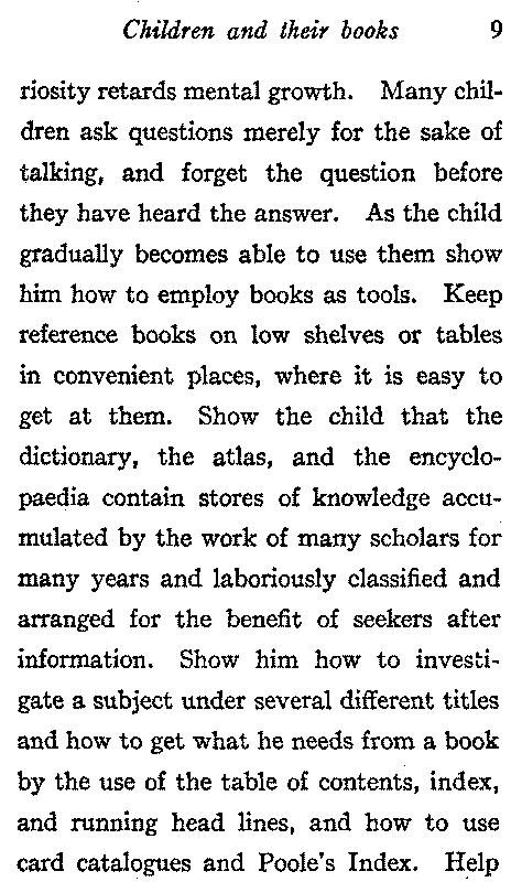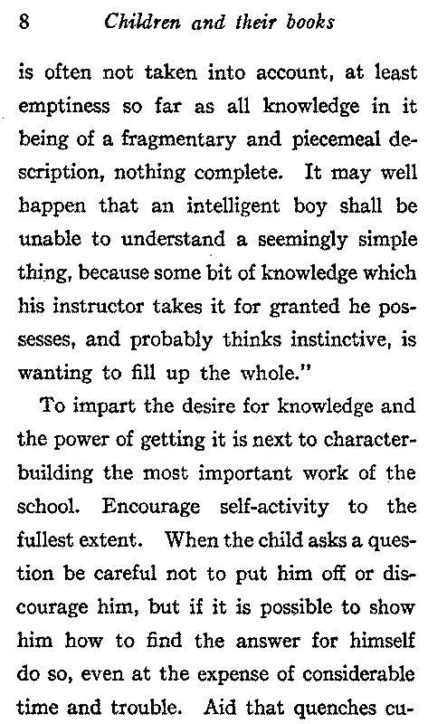 To impart the desire for knowledge and the power of getting it is next to character-building the most important work of the school. Encourage self-activity to the fullest extent. When the child asks a question be careful not to put him off or discourage him, but if it is possible to show him how to find the answer for himself do so, even at the expense of considerable time and trouble. Aid that quenches curiosity[9] retards mental growth. Many children ask questions merely for the sake of talking, and forget the question before they have heard the answer. As the child gradually becomes able to use them show him how to employ books as tools. Keep reference books on low shelves or tables in convenient places, where it is easy to get at them. Show the child that the dictionary, the atlas, and the encyclopaedia contain stores of knowledge accumulated by the work of many scholars for many years and laboriously classified and arranged for the benefit of seekers after information. Show him how to investigate a subject under several different titles and how to get what he needs from a book by the use of the table of contents, index, and running head lines, and how to use card catalogues and Poole's Index. Help[10] him to look up on the map the places he reads about. Explain the scale of miles and teach him to use his imagination in making the map real; show him that the dots represent towns and cities with churches, parks, and trolley cars, and that the waving lines are rivers on which are steam boats carrying the productions of one section to another.