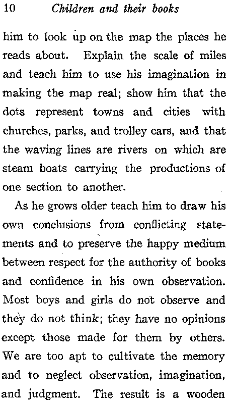 As he grows older teach him to draw his own conclusions from conflicting statements and to preserve the happy medium between respect for the authority of books and confidence in his own observation. Most boys and girls do not observe and they do not think; they have no opinions except those made for them by others. We are too apt to cultivate the memory and to neglect observation, imagination, and judgment. The result is a wooden[11] type of mind which has too great respect for printed matter and little initiative in accurate observation and in using the imagination and the judgment in making what has been observed and read practically useful.