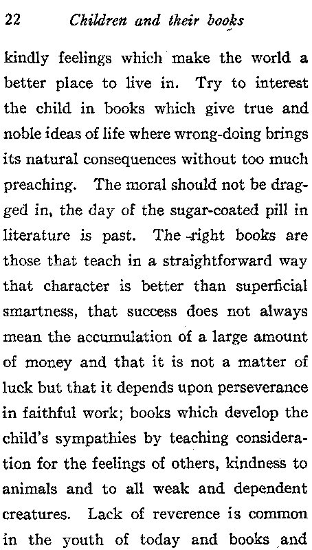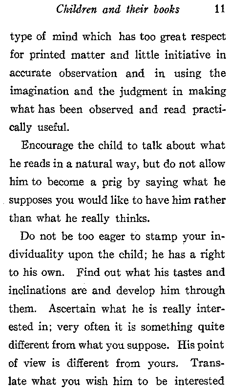 Encourage the child to talk about what he reads in a natural way, but do not allow him to become a prig by saying what he supposes you would like to have him rather than what he really thinks.