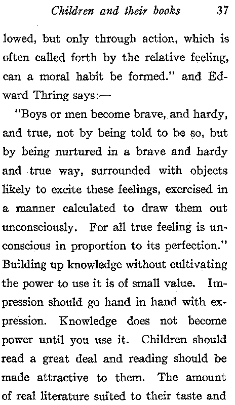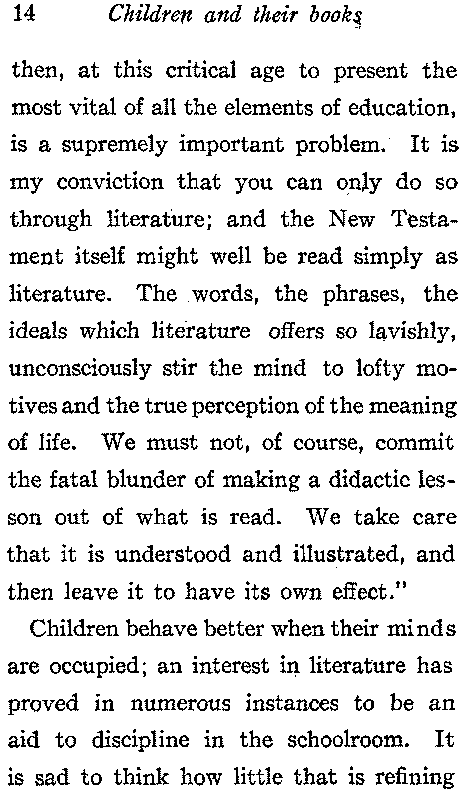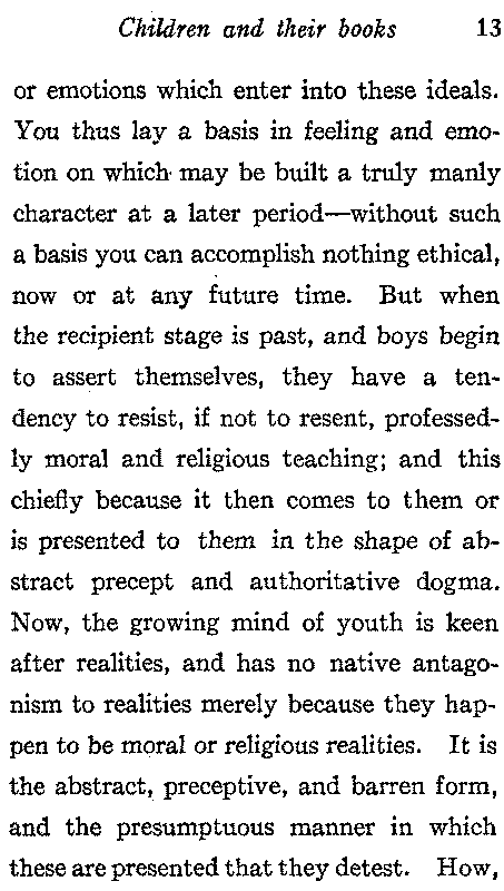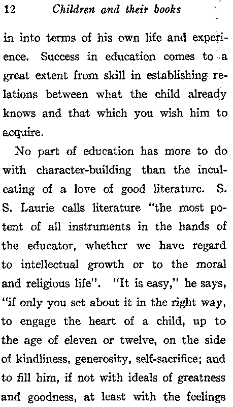 No part of education has more to do with character-building than the inculcating of a love of good literature. S. S. Laurie calls literature "the most potent of all instruments in the hands of the educator, whether we have regard to intellectual growth or to the moral and religious life". "It is easy," he says, "if only you set about it in the right way, to engage the heart of a child, up to the age of eleven or twelve, on the side of kindliness, generosity, self-sacrifice; and to fill him, if not with ideals of greatness and goodness, at least with the feelings[13] or emotions which enter into these ideals. You thus lay a basis in feeling and emotion on which may be built a truly manly character at a later period—without such a basis you can accomplish nothing ethical, now or at any future time. But when the recipient stage is past, and boys begin to assert themselves, they have a tendency to resist, if not to resent, professedly moral and religious teaching; and this chiefly because it then comes to them or is presented to them in the shape of abstract precept and authoritative dogma. Now, the growing mind of youth is keen after realities, and has no native antagonism to realities merely because they happen to be moral or religious realities. It is the abstract, preceptive, and barren form, and the presumptuous manner in which these are presented that they detest. How,[14] then, at this critical age to present the most vital of all the elements of education, is a supremely important problem. It is my conviction that you can only do so through literature; and the New Testament itself might well be read simply as literature. The words, the phrases, the ideals which literature offers so lavishly, unconsciously stir the mind to lofty motives and the true perception of the meaning of life. We must not, of course, commit the fatal blunder of making a didactic lesson out of what is read. We take care that it is understood and illustrated, and then leave it to have its own effect."