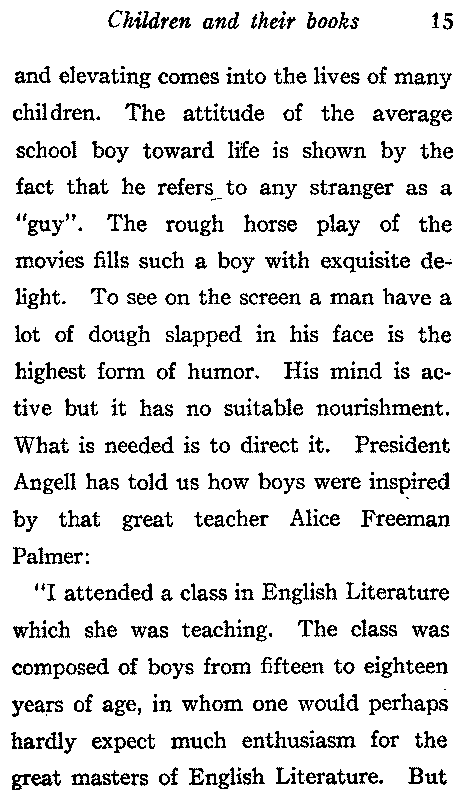Children behave better when their minds are occupied; an interest in literature has proved in numerous instances to be an aid to discipline in the schoolroom. It is sad to think how little that is refining[15] and elevating comes into the lives of many children. The attitude of the average school boy toward life is shown by the fact that he refers to any stranger as a "guy". The rough horse play of the movies fills such a boy with exquisite delight. To see on the screen a man have a lot of dough slapped in his face is the highest form of humor. His mind is active but it has no suitable nourishment. What is needed is to direct it. President Angell has told us how boys were inspired by that great teacher Alice Freeman Palmer:
