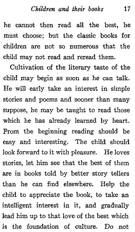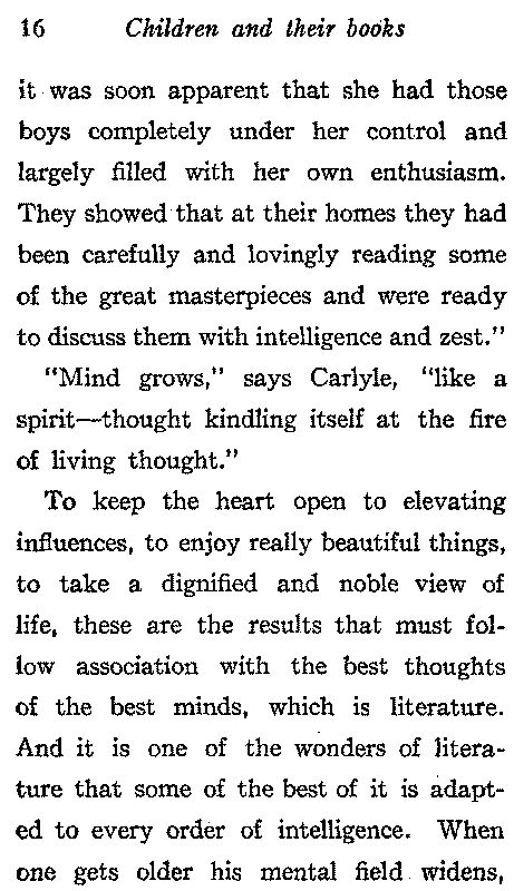 To keep the heart open to elevating influences, to enjoy really beautiful things, to take a dignified and noble view of life, these are the results that must follow association with the best thoughts of the best minds, which is literature. And it is one of the wonders of literature that some of the best of it is adapted to every order of intelligence. When one gets older his mental field widens,[17] he cannot then read all the best, he must choose; but the classic books for children are not so numerous that the child may not read and reread them.