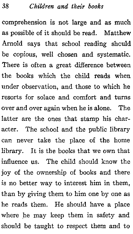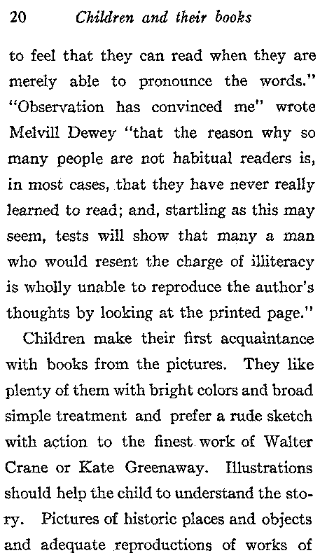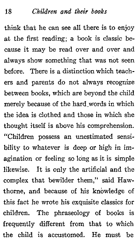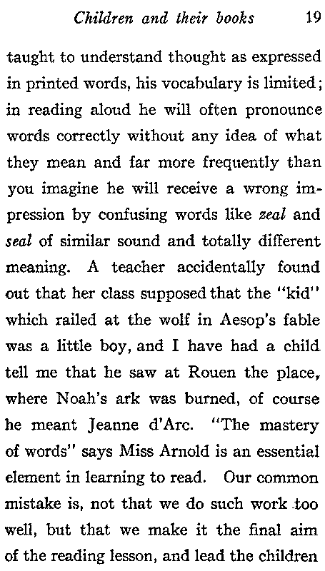 Cultivation of the literary taste of the child may begin as soon as he can talk. He will early take an interest in simple stories and poems and sooner than many suppose, he may be taught to read those which he has already learned by heart. From the beginning reading should be easy and interesting. The child should look forward to it with pleasure. He loves stories, let him see that the best of them are in books told by better story tellers than he can find elsewhere. Help the child to appreciate the book, to take an intelligent interest in it, and gradually lead him up to that love of the best which is the foundation of culture. Do not[18] think that he can see all there is to enjoy at the first reading; a book is classic because it may be read over and over and always show something that was not seen before. There is a distinction which teachers and parents do not always recognize between books, which are beyond the child merely because of the hard words in which the idea is clothed and those in which the thought itself is above his comprehension. "Children possess an unestimated sensibility to whatever is deep or high in imagination or feeling so long as it is simple likewise. It is only the artificial and the complex that bewilder them," said Hawthorne, and because of his knowledge of this fact he wrote his exquisite classics for children. The phraseology of books is frequently different from that to which the child is accustomed. He must be[19] taught to understand thought as expressed in printed words, his vocabulary is limited; in reading aloud he will often pronounce words correctly without any idea of what they mean and far more frequently than you imagine he will receive a wrong impression by confusing words like zeal and seal of similar sound and totally different meaning. A teacher accidentally found out that her class supposed that the "kid" which railed at the wolf in Aesop's fable was a little boy, and I have had a child tell me that he saw at Rouen the place, where Noah's ark was burned, of course he meant Jeanne d'Arc. "The mastery of words" says Miss Arnold is an essential element in learning to read. Our common mistake is, not that we do such work too well, but that we make it the final aim of the reading lesson, and lead the children[20] to feel that they can read when they are merely able to pronounce the words." "Observation has convinced me" wrote Melvill Dewey "that the reason why so many people are not habitual readers is, in most cases, that they have never really learned to read; and, startling as this may seem, tests will show that many a man who would resent the charge of illiteracy is wholly unable to reproduce the author's thoughts by looking at the printed page."
