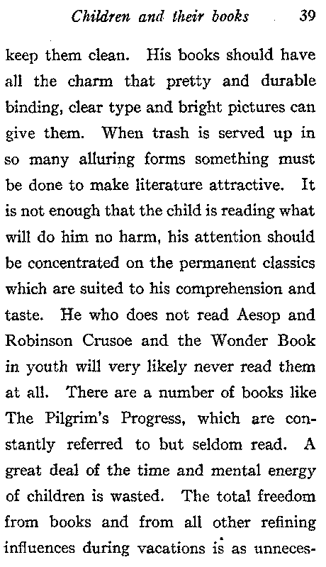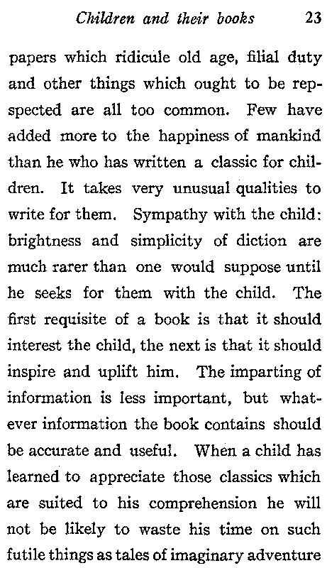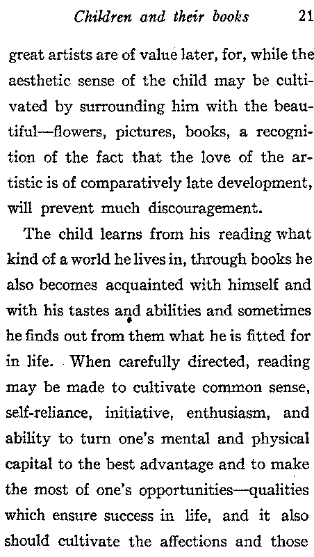 The child learns from his reading what kind of a world he lives in, through books he also becomes acquainted with himself and with his tastes and abilities and sometimes he finds out from them what he is fitted for in life. When carefully directed, reading may be made to cultivate common sense, self-reliance, initiative, enthusiasm, and ability to turn one's mental and physical capital to the best advantage and to make the most of one's opportunities—qualities which ensure success in life, and it also should cultivate the affections and those[22] kindly feelings which make the world a better place to live in. Try to interest the child in books which give true and noble ideas of life where wrong-doing brings its natural consequences without too much preaching. The moral should not be dragged in, the day of the sugar-coated pill in literature is past. The right books are those that teach in a straightforward way that character is better than superficial smartness, that success does not always mean the accumulation of a large amount of money and that it is not a matter of luck but that it depends upon perseverance in faithful work; books which develop the child's sympathies by teaching consideration for the feelings of others, kindness to animals and to all weak and dependent creatures. Lack of reverence is common in the youth of today and books and[23] papers which ridicule old age, filial duty and other things which ought to be respected are all too common. Few have added more to the happiness of mankind than he who has written a classic for children. It takes very unusual qualities to write for them. Sympathy with the child: brightness and simplicity of diction are much rarer than one would suppose until he seeks for them with the child. The first requisite of a book is that it should interest the child, the next is that it should inspire and uplift him. The imparting of information is less important, but whatever information the book contains should be accurate and useful. When a child has learned to appreciate those classics which are suited to his comprehension he will not be likely to waste his time on such futile things as tales of imaginary adventure[24] thickened with a little inaccurate history. He will prefer books which describe what really happened to those which tell what someone writing long after thinks possibly might have happened.