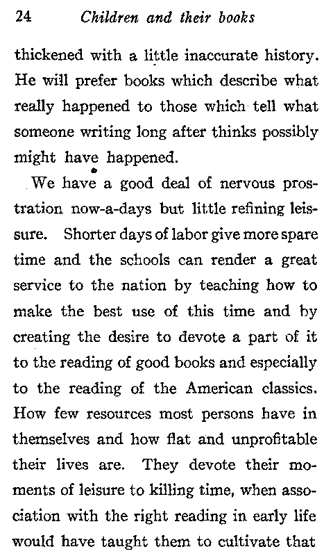 We have a good deal of nervous prostration now-a-days but little refining leisure. Shorter days of labor give more spare time and the schools can render a great service to the nation by teaching how to make the best use of this time and by creating the desire to devote a part of it to the reading of good books and especially to the reading of the American classics. How few resources most persons have in themselves and how flat and unprofitable their lives are. They devote their moments of leisure to killing time, when association with the right reading in early life would have taught them to cultivate that[25] inward eye which has been called the bliss of solitude. He who has a love of reading, however limited his means or however restricted his opportunities may give himself, if he will, a good education. He, who has a taste for good books in youth, will rarely read anything else in maturer years.