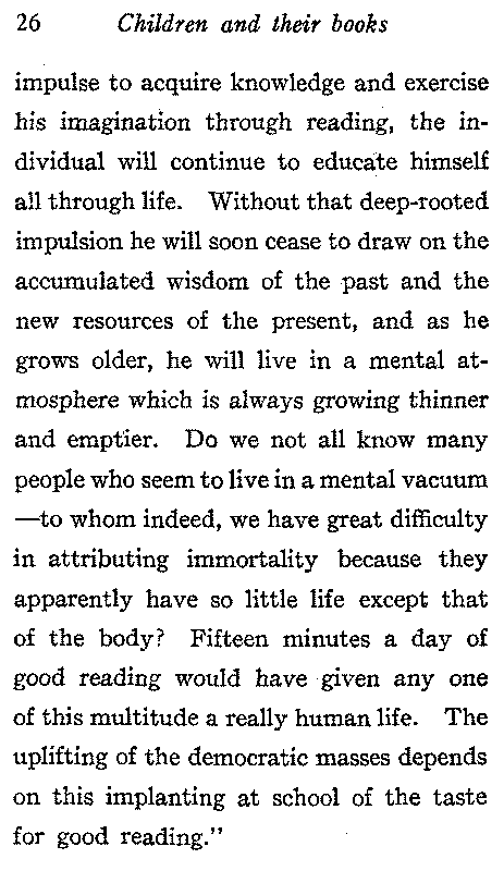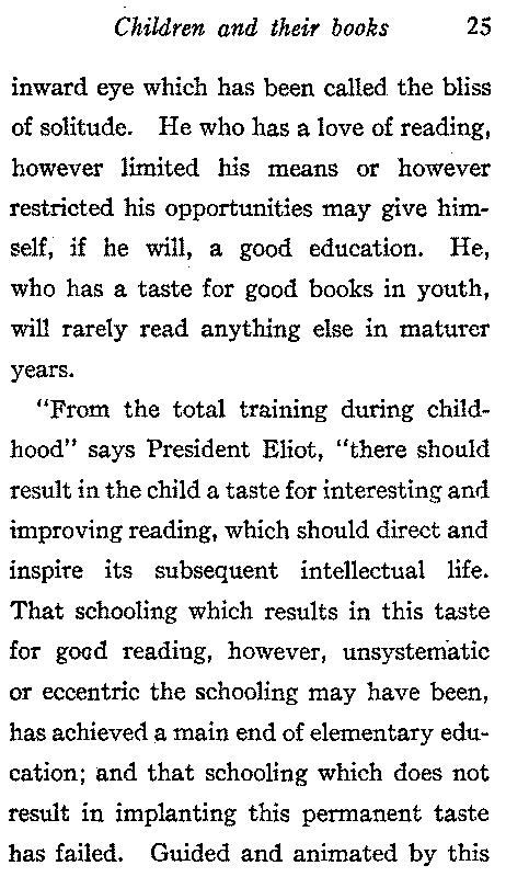 "From the total training during childhood" says President Eliot, "there should result in the child a taste for interesting and improving reading, which should direct and inspire its subsequent intellectual life. That schooling which results in this taste for good reading, however, unsystematic or eccentric the schooling may have been, has achieved a main end of elementary education; and that schooling which does not result in implanting this permanent taste has failed. Guided and animated by this[26] impulse to acquire knowledge and exercise his imagination through reading, the individual will continue to educate himself all through life. Without that deep-rooted impulsion he will soon cease to draw on the accumulated wisdom of the past and the new resources of the present, and as he grows older, he will live in a mental atmosphere which is always growing thinner and emptier. Do we not all know many people who seem to live in a mental vacuum—to whom indeed, we have great difficulty in attributing immortality because they apparently have so little life except that of the body? Fifteen minutes a day of good reading would have given any one of this multitude a really human life. The uplifting of the democratic masses depends on this implanting at school of the taste for good reading."[27]