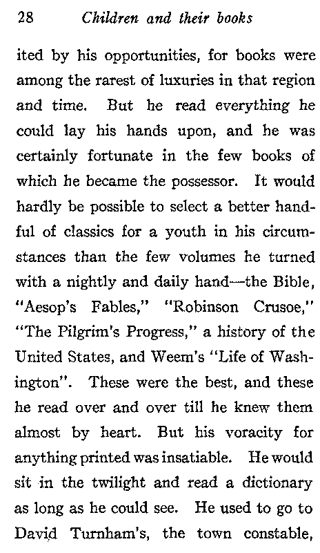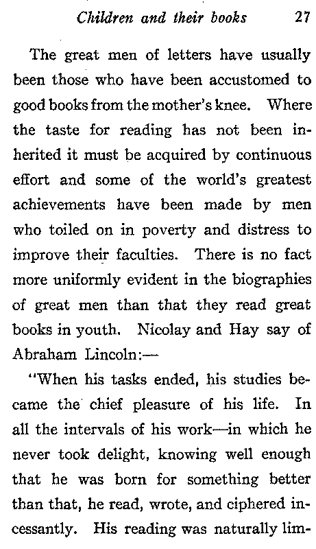 The great men of letters have usually been those who have been accustomed to good books from the mother's knee. Where the taste for reading has not been inherited it must be acquired by continuous effort and some of the world's greatest achievements have been made by men who toiled on in poverty and distress to improve their faculties. There is no fact more uniformly evident in the biographies of great men than that they read great books in youth. Nicolay and Hay say of Abraham Lincoln:—