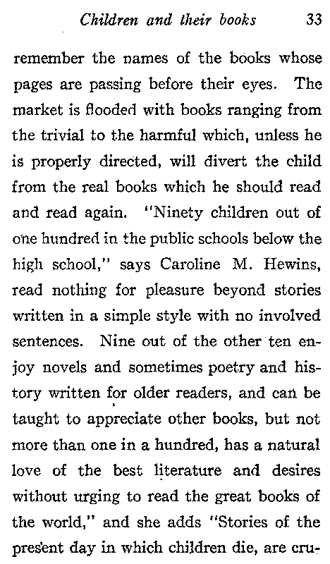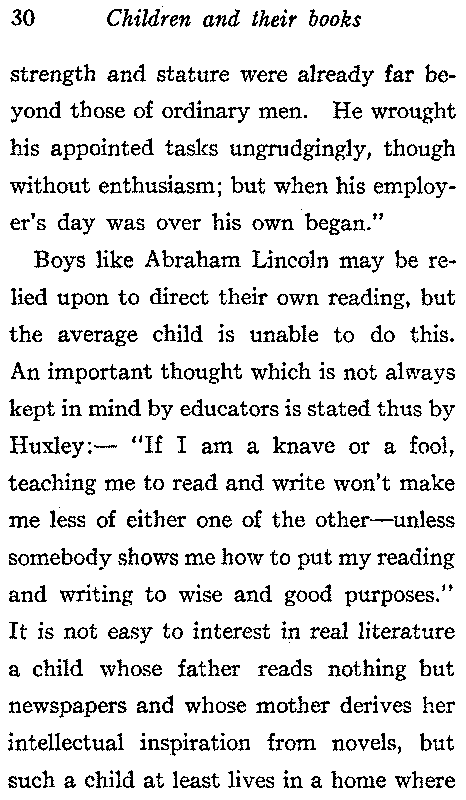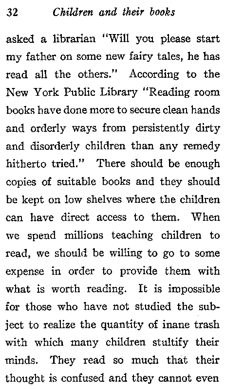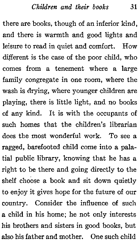 Boys like Abraham Lincoln may be relied upon to direct their own reading, but the average child is unable to do this. An important thought which is not always kept in mind by educators is stated thus by Huxley:—"If I am a knave or a fool, teaching me to read and write won't make me less of either one of the other—unless somebody shows me how to put my reading and writing to wise and good purposes." It is not easy to interest in real literature a child whose father reads nothing but newspapers and whose mother derives her intellectual inspiration from novels, but such a child at least lives in a home where[31] there are books, though of an inferior kind, and there is warmth and good lights and leisure to read in quiet and comfort. How different is the case of the poor child, who comes from a tenement where a large family congregate in one room, where the wash is drying, where younger children are playing, there is little light, and no books of any kind. It is with the occupants of such homes that the children's librarian does the most wonderful work. To see a ragged, barefooted child come into a palatial public library, knowing that he has a right to be there and going directly to the shelf choose a book and sit down quietly to enjoy it gives hope for the future of our country. Consider the influence of such a child in his home; he not only interests his brothers and sisters in good books, but also his father and mother. One such child[32] asked a librarian "Will you please start my father on some new fairy tales, he has read all the others." According to the New York Public Library "Reading room books have done more to secure clean hands and orderly ways from persistently dirty and disorderly children than any remedy hitherto tried." There should be enough copies of suitable books and they should be kept on low shelves where the children can have direct access to them. When we spend millions teaching children to read, we should be willing to go to some expense in order to provide them with what is worth reading. It is impossible for those who have not studied the subject to realize the quantity of inane trash with which many children stultify their minds. They read so much that their thought is confused and they cannot even[33] remember the names of the books whose pages are passing before their eyes. The market is flooded with books ranging from the trivial to the harmful which, unless he is properly directed, will divert the child from the real books which he should read and read again. "Ninety children out of one hundred in the public schools below the high school," says Caroline M. Hewins, "read nothing for pleasure beyond stories written in a simple style with no involved sentences. Nine out of the other ten enjoy novels and sometimes poetry and history written for older readers, and can be taught to appreciate other books, but not more than one in a hundred, has a natural love of the best literature and desires without urging to read the great books of the world," and she adds "Stories of the present day in which children die, are cruelly[34] treated, or offer advice to their elders, are not good reading for boys and girls in happy homes."