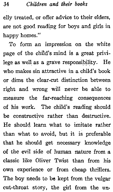 To form an impression on the white page of the child's mind is a great privilege as well as a grave responsibility. He who makes sin attractive in a child's book or dims the clear-cut distinction between right and wrong will never be able to measure the far-reaching consequences of his work. The child's reading should be constructive rather than destructive. He should learn what to imitate rather than what to avoid, but it is preferable that he should get necessary knowledge of the evil side of human nature from a classic like Oliver Twist than from his own experience or from cheap thrillers. The boy needs to be kept from the vulgar cut-throat story, the girl from the unwholesome[35] romance. Girls should read books that exalt the sweet home virtues. Cheap society stories are not necessarily immoral but they give false ideas of life, warp the mind and encourage selfishness.