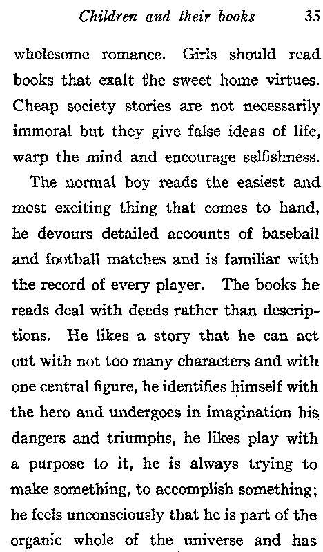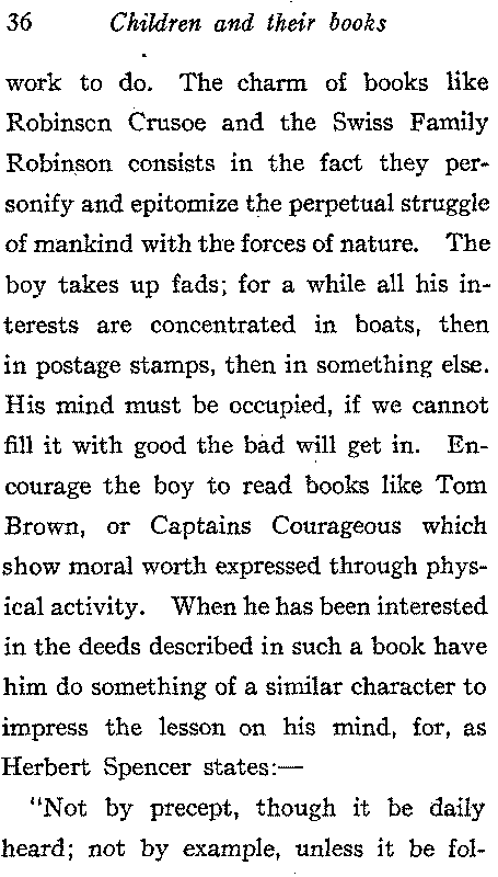 The normal boy reads the easiest and most exciting thing that comes to hand, he devours detailed accounts of baseball and football matches and is familiar with the record of every player. The books he reads deal with deeds rather than descriptions. He likes a story that he can act out with not too many characters and with one central figure, he identifies himself with the hero and undergoes in imagination his dangers and triumphs, he likes play with a purpose to it, he is always trying to make something, to accomplish something; he feels unconsciously that he is part of the organic whole of the universe and has[36] work to do. The charm of books like Robinson Crusoe and the Swiss Family Robinson consists in the fact they personify and epitomize the perpetual struggle of mankind with the forces of nature. The boy takes up fads; for a while all his interests are concentrated in boats, then in postage stamps, then in something else. His mind must be occupied, if we cannot fill it with good the bad will get in. Encourage the boy to read books like Tom Brown, or Captains Courageous which show moral worth expressed through physical activity. When he has been interested in the deeds described in such a book have him do something of a similar character to impress the lesson on his mind, for, as Herbert Spencer states:—