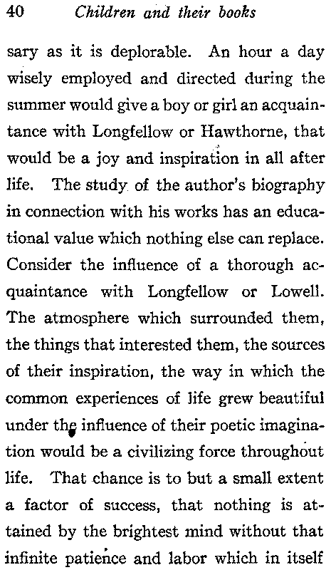 "Boys or men become brave, and hardy, and true, not by being told to be so, but by being nurtured in a brave and hardy and true way, surrounded with objects likely to excite these feelings, exercised in a manner calculated to draw them out unconsciously. For all true feeling is unconscious in proportion to its perfection." Building up knowledge without cultivating the power to use it is of small value. Impression should go hand in hand with expression. Knowledge does not become power until you use it. Children should read a great deal and reading should be made attractive to them. The amount of real literature suited to their taste and[38] comprehension is not large and as much as possible of it should be read. Matthew Arnold says that school reading should be copious, well chosen and systematic. There is often a great difference between the books which the child reads when under observation, and those to which he resorts for solace and comfort and turns over and over again when he is alone. The latter are the ones that stamp his character. The school and the public library can never take the place of the home library. It is the books that we own that influence us. The child should know the joy of the ownership of books and there is no better way to interest him in them, than by giving them to him one by one as he reads them. He should have a place where he may keep them in safety and should be taught to respect them and to[39] keep them clean. His books should have all the charm that pretty and durable binding, clear type and bright pictures can give them. When trash is served up in so many alluring forms something must be done to make literature attractive. It is not enough that the child is reading what will do him no harm, his attention should be concentrated on the permanent classics which are suited to his comprehension and taste. He who does not read Aesop and Robinson Crusoe and the Wonder Book in youth will very likely never read them at all. There are a number of books like The Pilgrim's Progress, which are constantly referred to but seldom read. A great deal of the time and mental energy of children is wasted. The total freedom from books and from all other refining influences during vacations is as unnecessary[40] as it is deplorable. An hour a day wisely employed and directed during the summer would give a boy or girl an acquaintance with Longfellow or Hawthorne, that would be a joy and inspiration in all after life. The study of the author's biography in connection with his works has an educational value which nothing else can replace. Consider the influence of a thorough acquaintance with Longfellow or Lowell. The atmosphere which surrounded them, the things that interested them, the sources of their inspiration, the way in which the common experiences of life grew beautiful under the influence of their poetic imagination would be a civilizing force throughout life. That chance is to but a small extent a factor of success, that nothing is attained by the brightest mind without that infinite patience and labor which in itself[41] is genius, the brave way in which such men met trial and adversity:—these are lessons which are not studied as they should be.